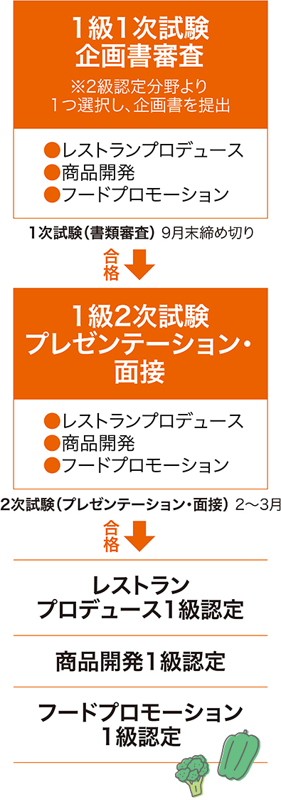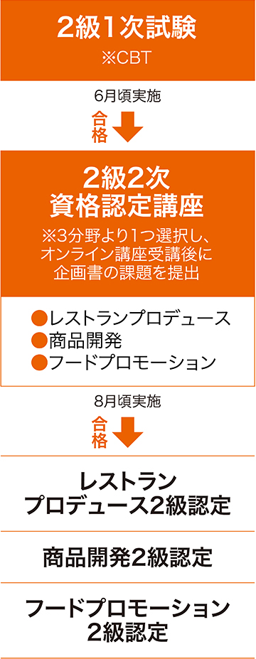 2級資格認定試験では、「レストランプロデュース」「商品開発」「食の生産・流通・消費」「ホスピタリティ&ライフサポート」「イベント・メディア」など、フードビジネスに関わる専門知識と企画力を試します。